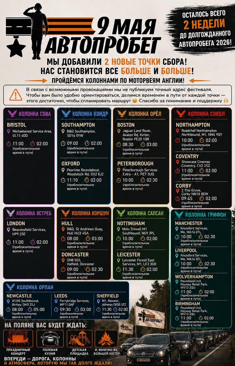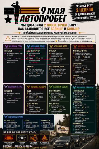 В этом году мы снова соберёмся в колонны и пройдём по моторвеям Англии — вместе, красиво и мощно. Это не просто дорога, это часть той самой атмосферы, по которой мы так скучали с 2019 года.